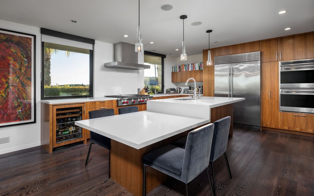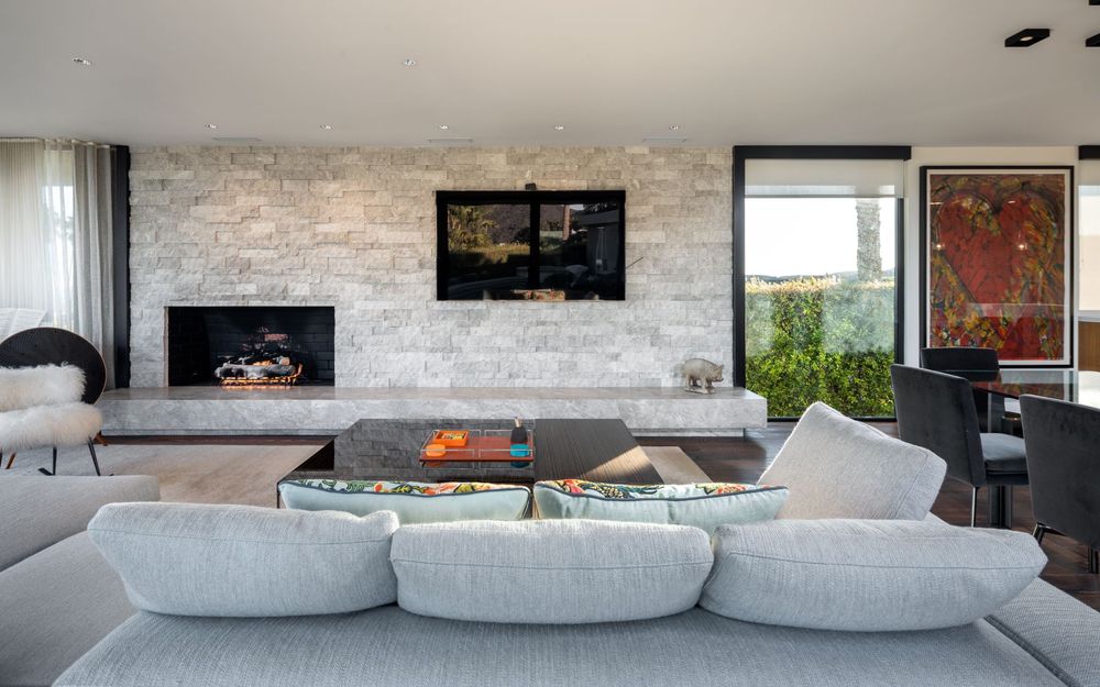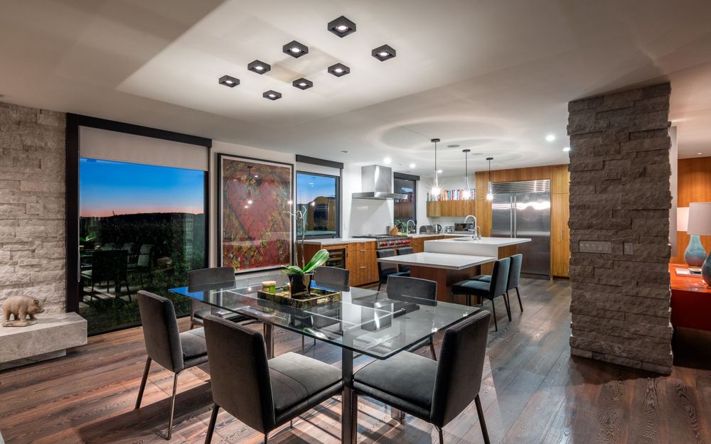 The home boasts with a saltwater swimming pool and spa, wood flooring that runs throughout the open-plan living, dining and kitchen areas, stacked-stone accent walls and vast banks of floor-to-ceiling glass sliders that allow for seamless transitions to a variety of patios that surround the house.